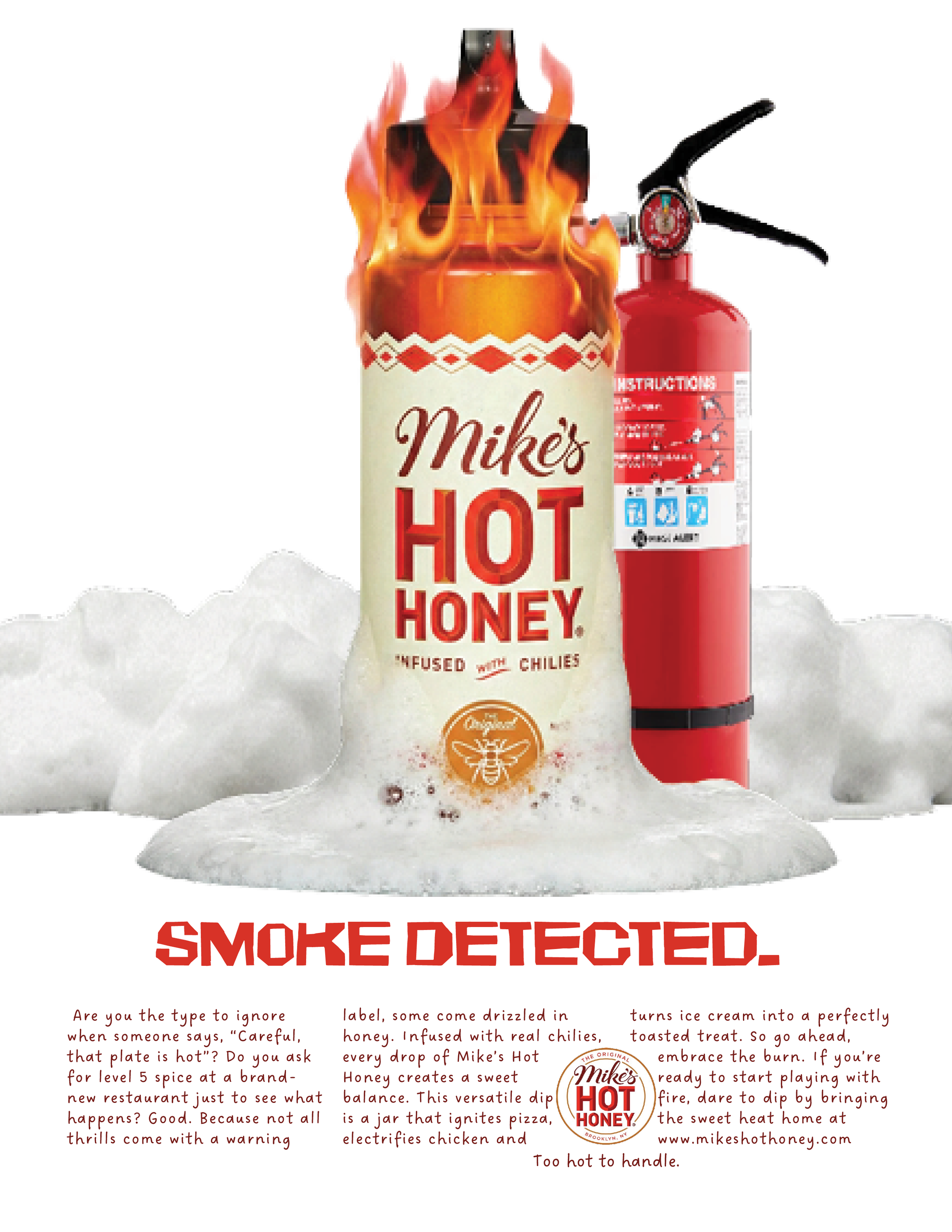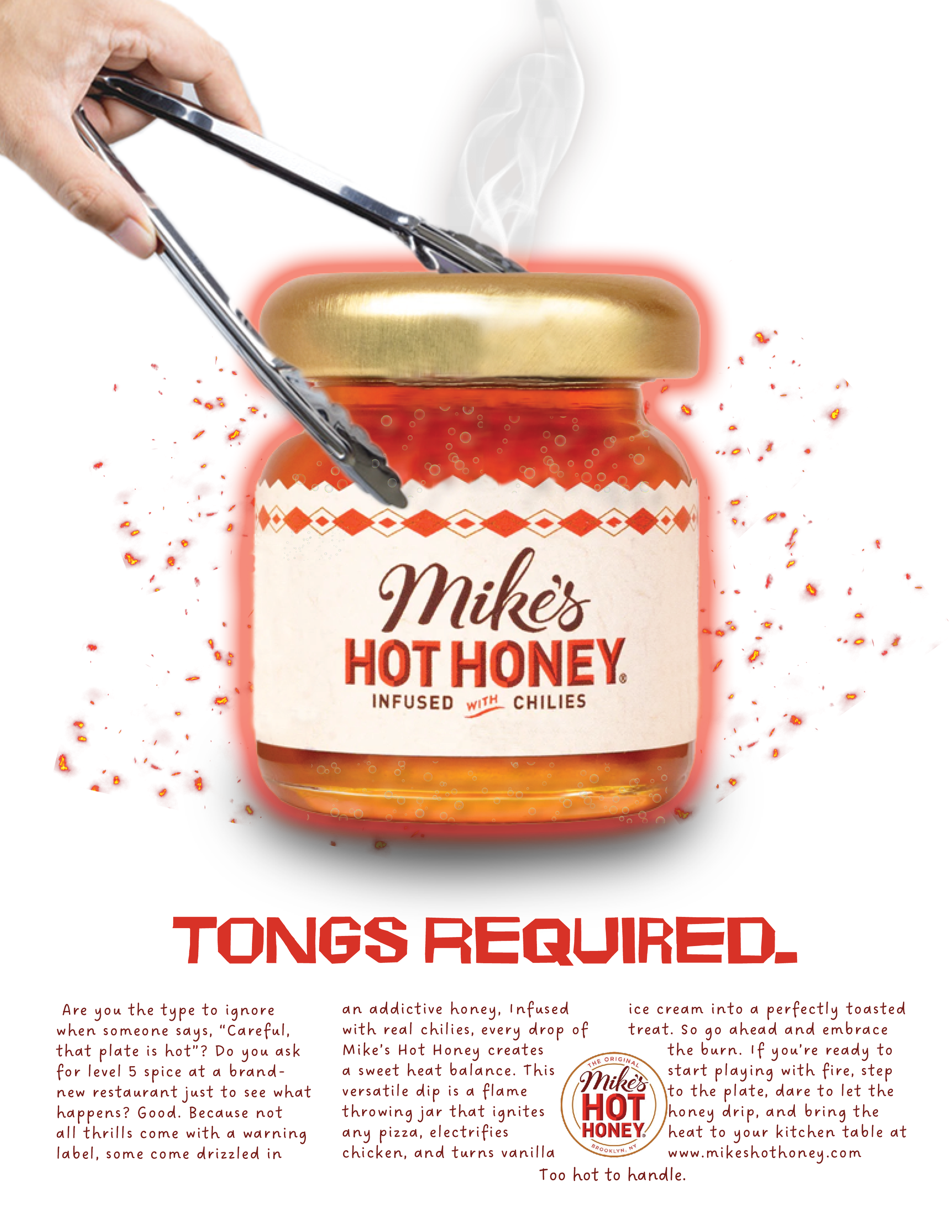 Print Ads: Mike’s Hot Honey is packed with so many chilies, these jars are pipin’ hot. Placed in culture, lifestyle, and food culture magazines for thrill-seeking eaters.